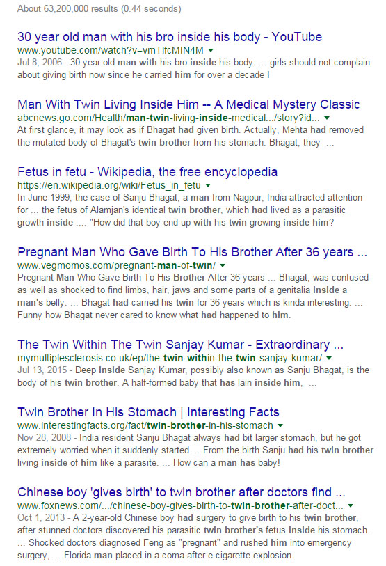 I was talking to my wife about a guy who failed a paternity test because his baby was actually born to his twin brother – who was still inside him. Searching for that article now, I found this: